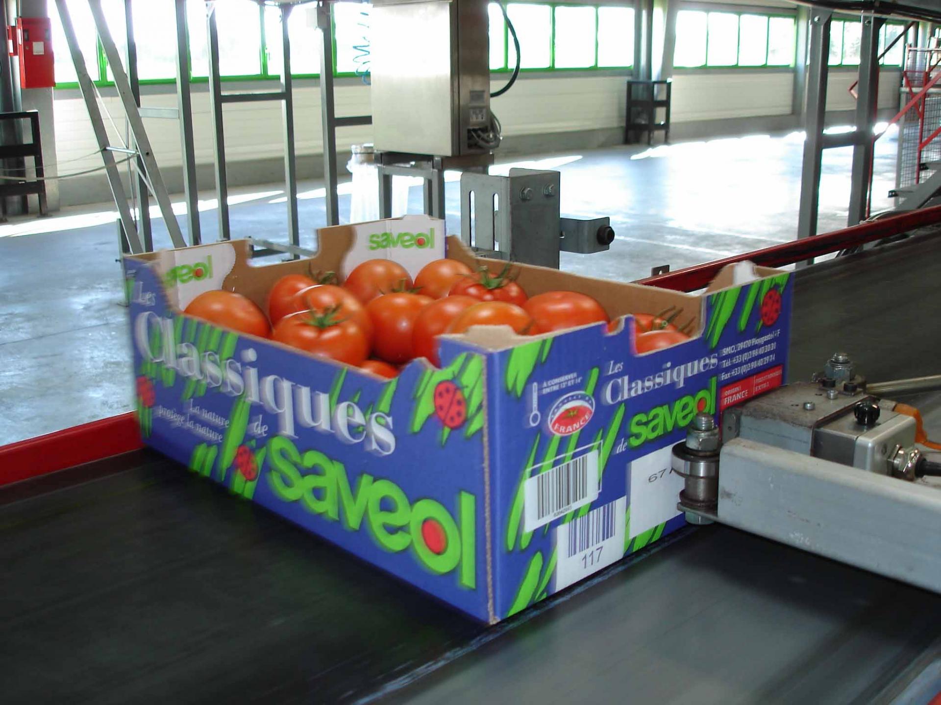 Marquage plateaux de tomates sur convoyeur
